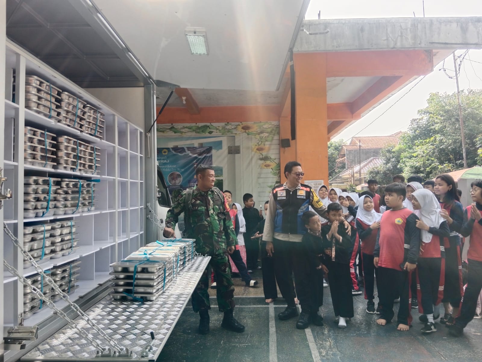 Bhabinkamtibmas Polsek Lengkong Aiptu Amat,S.I.Kom pengawasan pendistribusian program Makan Bergizi Gratis (MBG) dari Dapur Yonkav Jalan Salak No.2 Bandung, Untuk SDN 115 Turangga Jalan Turangga No.27 Kota Bandung, Kamis (20/02/2025).