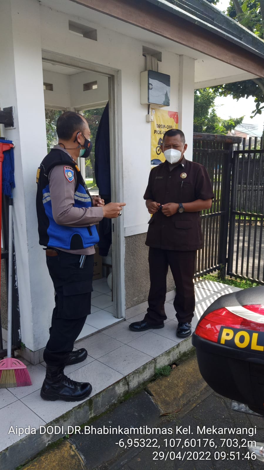 Polrestabes Bandung bhabinkamtibmas kelurahan mekarwangi Aipda Dodi Melaksanakan Giat Sambang, Binkamsa satpam Bintang Mulya Kepada Danru Satpam Bp Ade Jl Rd Rangga Kencana Rw.04, Kelurahan Mekarwangi Kecamatan bojongloa kidul memberikan Himbauan Kamtibmas, Menjelang Idul Fitri 1443H,Vaksin Boosteur, dan Sosialisasi PPKM Level 2, di Kota Bandung dengan menerapkan 5M dalam rangka memutus mata rantai penyebaran Virus Corona/Covid19 .
