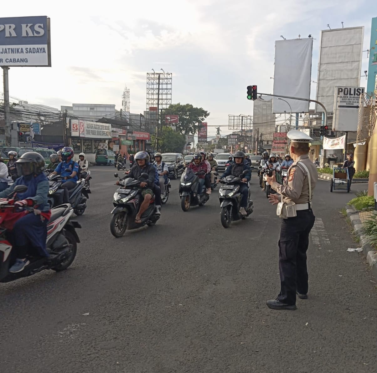 Antisipasi kemacetan pagi hari, personil lalulintas Polsek Sukasari melaksanakan pengamanan jalur di titik rawan kemacetan Wilayah Hukum Polsek Sukasari Polrestabes Bandung.