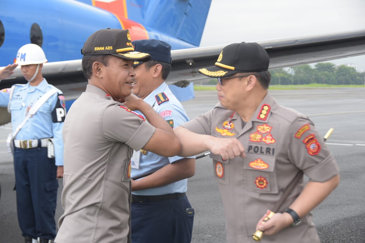 Kapolrestabes Bandung Kombes Pol Ulung Sampurna Jaya S.IK.,M.H mendampingi Kapolda Jabar Irjen Pol. Drs Rudy Sufahriadi menyambut Kedatangan Bapak Kapolri Jenderal Polisi Drs. Idham Azis, M.si beserta rombongan di Lanud Husein Sastranegara Bandung