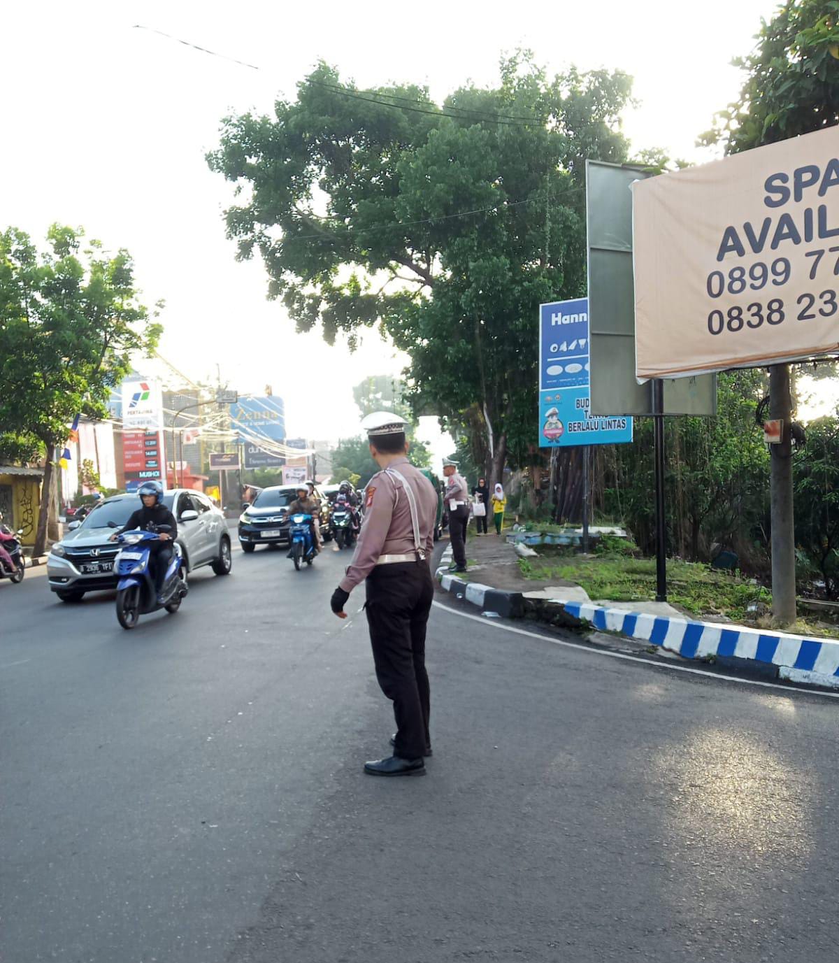Personel lalulintas Polsek Arcamanik melaksanakan pengaturan antisipsi kemacetan pada pagi hari