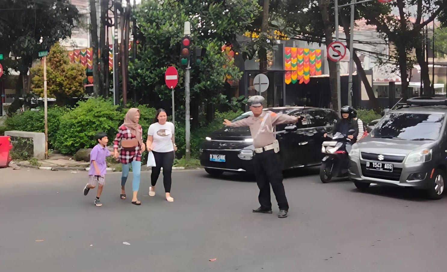 Polantas Polsek Sukajadi Bantu Anak Sekolah dan Masyarakat Menyeberang Jalan, Cegah Kecelakaan dan Kepadatan Lalu Lintas