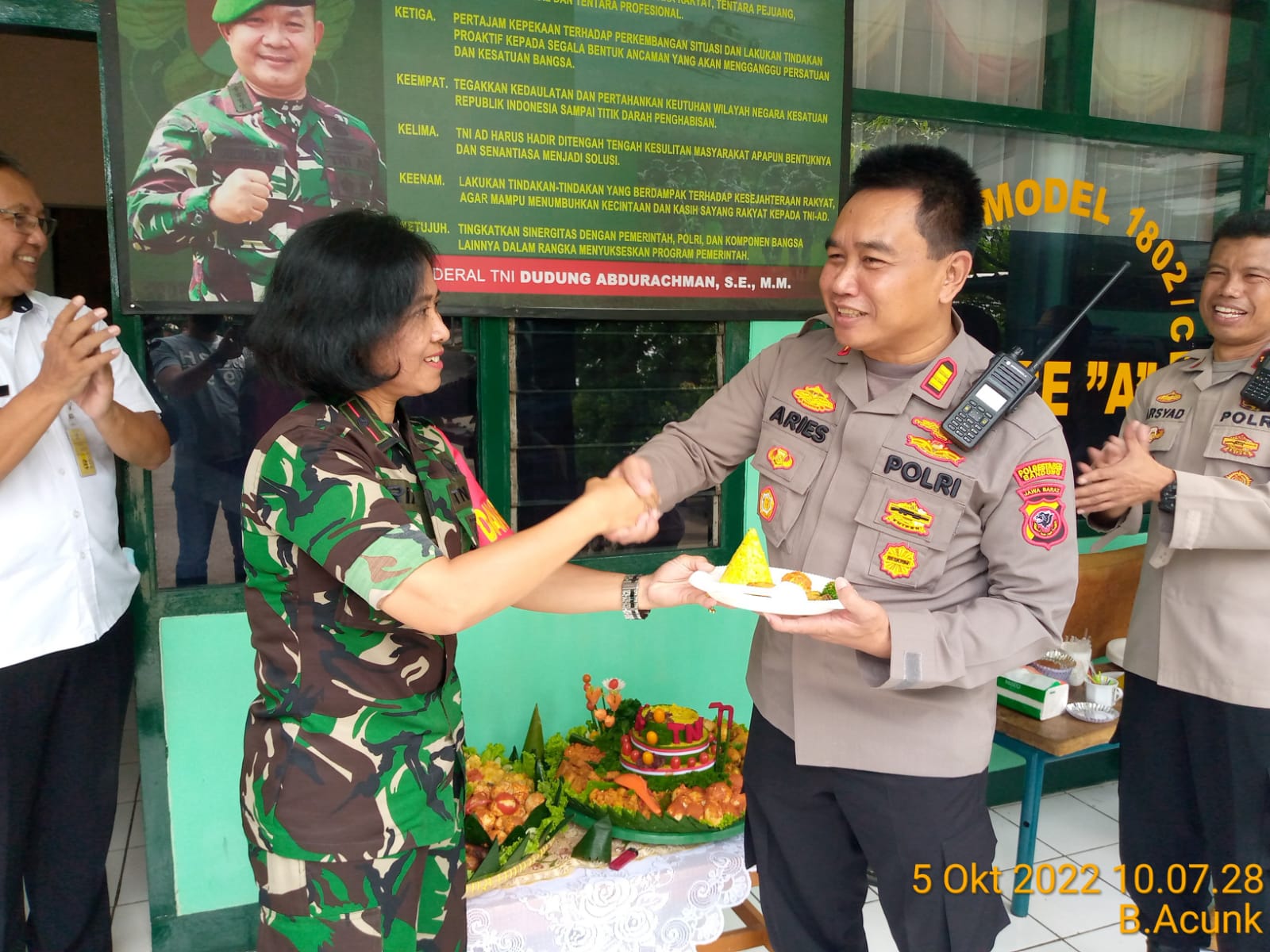 Polrestabes Bandung -Kapolsek Cibeunying kidul beserta anggota Bertempat di Mako Koranmil Koramil 1802/CBY Telah berlangsung kegiatan Ucapan Selamat HUT TNI yang ke 77 oleh Kapolsek Cibeunying kidul AKP Aries Riyanto, S.Sos.,MM.,CHRA., Beserta anggota Polsek Cibeunying Kidul