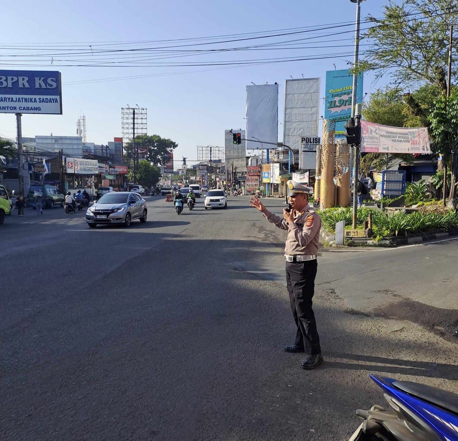 Antisipasi kemacetan pagi hari, personil lalu lintas Polsek Sukasari melaksanakan pengamanan jalur di titik rawan kemacetan Wilayah Hukum Polsek Sukasari Polrestabes Bandung.